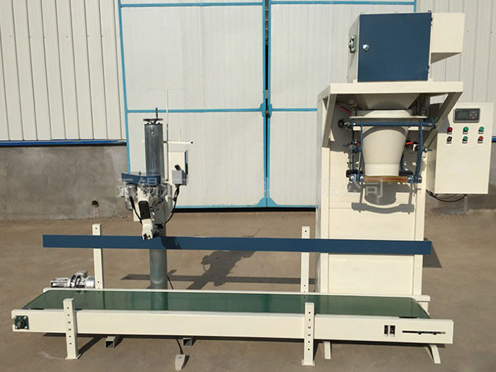 人工上袋,機器自動稱重灌裝、自動松袋,經輸送帶傳遞到縫包機進行縫包、傳輸。